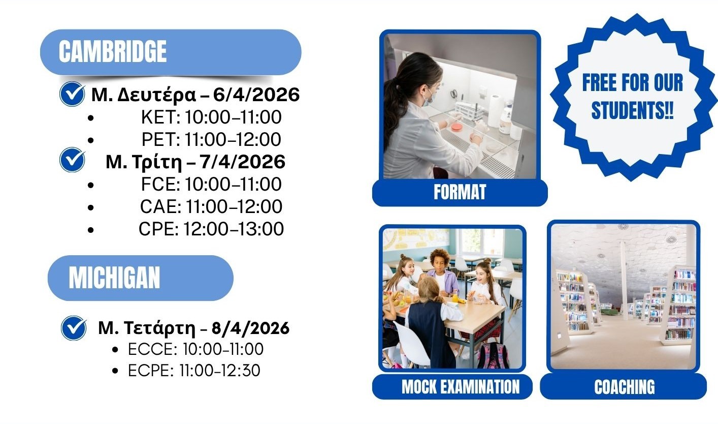 Στο πλαίσιο της συνεχούς υποστήριξης που προσφέρουμε στους μαθητές μας και της στενής συνεργασίας μας με τους επίσημους εξεταστικούς φορείς, σας ενημερώνουμε ότι διοργανώνονται ειδικά σεμινάρια προετοιμασίας για το Speaking μέρος των εξετάσεων Cambridge & Michigan.