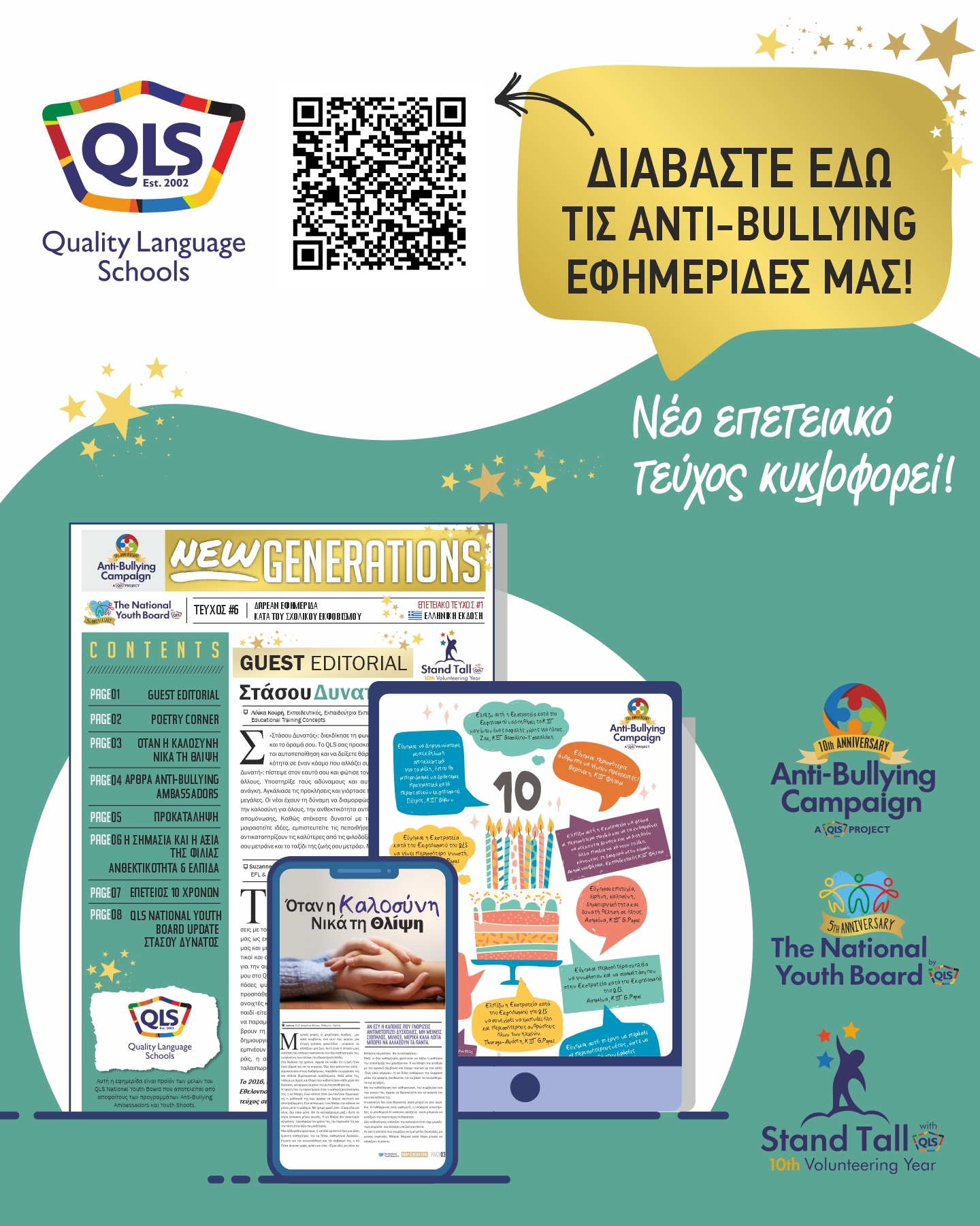 Το 6ο τεύχος της Anti-Bullying Εφημερίδας "New Generations" του Δικτύου QLS μόλις κυκλοφόρησε με πλούσια θεματολογία επιμελημένη από τους μαθητές που απαρτίζουν το QLS National Youth Board. Σκανάρετε το QR code και διαβάσετε όλα τα τεύχη!